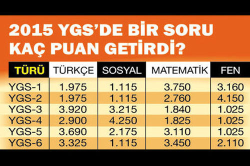 YGS sonunda her adayın 6 farklı puan türü hesaplanacak. Bunlar: YGS-1, YGS-2, YGS-3, YGS-4, YGS-5 ve YGS-6. Bu puanlardan YGS-1 ve 2 Sayısal, YGS-3 ve 4 Sözel, YGS-5 ve 6 ise Eşit Ağırlık puan türlerini ifade ediyor.