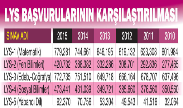 Bu yıl LYS’lere girme hakkını elde edemeyen aday sayısı da 517 bin 25 oldu. Bu adaylar YGS’nin herhangi bir puan türünde 180 ve üzerinde puan alamadıkları için sınavlara katılma hakkını kaybetti. EN BÜYÜK TALEP LYS-1’E LYS başvuruları incelendiğinde ise en büyük başvurunun Matematik Sınavı’na (LYS-1) olduğu görülüyor. Geçen yıl LYS- 1’e başvuran aday sayısı 779 bin 281 olmuştu. İkinci sırada ise Edebiyat-Coğrafya Sınavı (LYS-3) geliyor. Bu sınava başvuranların sayısı da 772 bin 735 oldu. Fen Bilimleri (LYS-2) ile Sosyal Bilimler (LYS-4) sınavlarına da 400 binin üzerinde aday başvuruda bulunuyor.