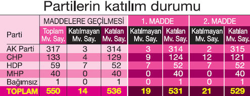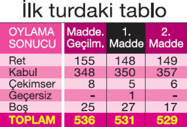 Dokunulmazlık oylamasının ilk turunun ardından Meclis ikinci tur oylamaya hazırlanıyor. İlk oylamada 348 olan evet oyları son maddede 357’ye çıkarak, 367 olan referandum sınırına yaklaştı. Yarın yapılacak oylama nihai sonucu vereceği için partiler fire konusunda alarma geçti. Teklifin birinci maddesi 330’un üzerinde oy alırsa, referandum ihtimali ortaya çıkacak. CHP’nin, olası bir referandumda AK Parti-MHP blokuna karşı HDP ile yan yana görüntü vermemek için, teklifin tümünün oylamasında “evet” oyu vermesi bekleniyor.