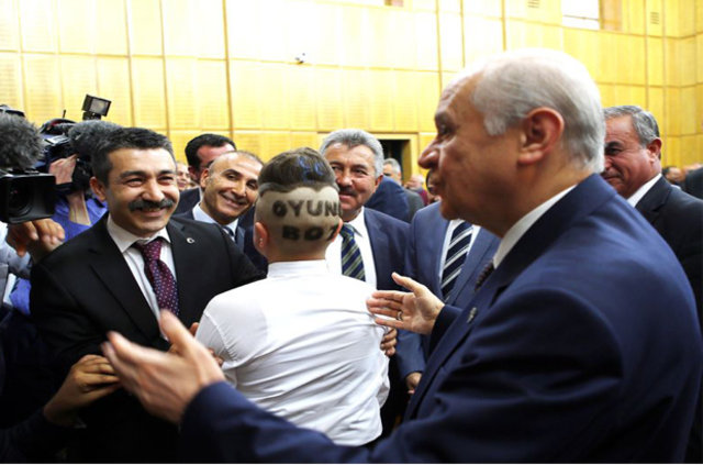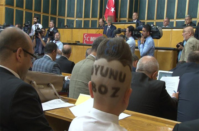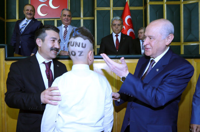 MHP Genel Başkanı Devlet Bahçeli, partisinin TBMM'de düzenlenen grup toplantısına katılan bir çocuğun saçlarına 'Oyunu Boz' yazısı kazıttığı tıraşı görünce şaşkınlık yaşadı.