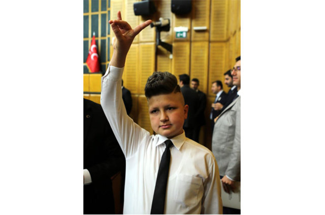 Saçının arkasını 'Oyunu Boz' şeklinde kestiren 14 yaşındaki Alper Beksiz, MHP'nin grup toplantısına katıldı