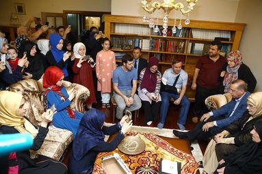 Huber Köşkü'nden çıkan Erdoğan önce Sarıyer'de şehit Fatih Satır'ın ailesine ziyarette bulundu. Erdoğan'a vatandaşlar yoğun ilgi gösterdi. Erdoğan'a eşi Emine Erdoğan ve oğlu Bilal Erdoğan da eşlik etti. Erdoğan evden çıkışında oğlu Bilal Erdoğan'ın tuttuğu megafonla vatandaşlara hitap etti. Herkesi yarın yapılacak Demokrasi ve Şehitler Mitingi'ne davet eden Erdoğan, "Yarın inşallah Yenikapı'da tüm İstanbul oradayız. Aynı anda inşallah 80 vilayette Yenikapı'yı takip edecek. Tüm Türkiye yarın Yenikapı'daki bütün merasimi takip edecek. İktidar partisinin genel başkanı, ana muhalefet partisinin genel başkanı ve MHP Genel Başkanı orada olacak. Meclis başkanımız orada olacak sizlere hitap edeceğiz. Orada sizlerle bir arada olacağız. İnşallah Kur'an-ı Kerim tilavetleriyle şehitlerimizi yad edeceğiz, gazilerimize şifalar dileyeceğiz, geleceğe de böyle yürüyeceğiz"diye konuştu.