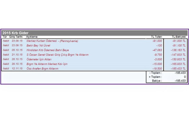 Bunun yanı sıra yine ele geçirilen makbuz kayıtlarından 185 bin 433 TL'lik kurban bağışının, 91 bin TL'sinin merkez kuran ödemesi olarak Pensilvanya'ya, 100 TL'sinin yol ücretine, 9 bin 750 TL, 3 bin TL, 15 bin TL, 19 bin 500 TL'nin de çeşitli ödemeler için ayrı ayrı ayrıldığı belirlendi.