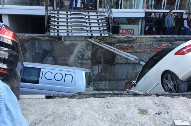 Merter'de yaklaşık 20 metre genişliğindeki çukura park halinde bulunan aralarında lüks otomobillerinde bulunduğu 5 araç düştü