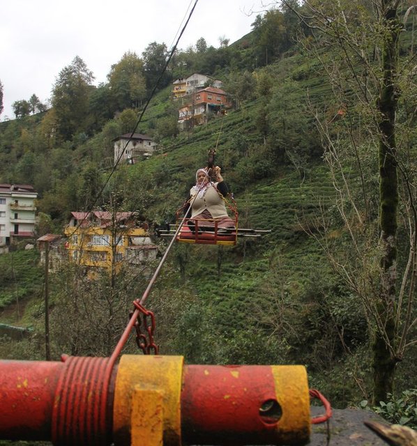 Rize'de kuma olan iki yaşlı kadın, geçirdikleri rahatsızlıklardan dolayı yolu olmayan evlerine ulaşmak için ölümü göze alarak 70 metre derinlikteki vadiyi ilkel teleferikle geçiyorlar.