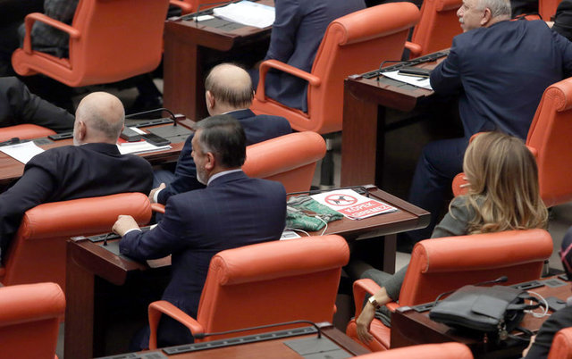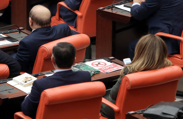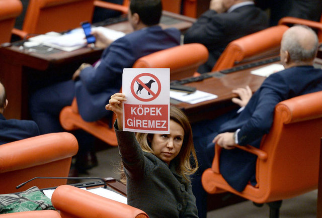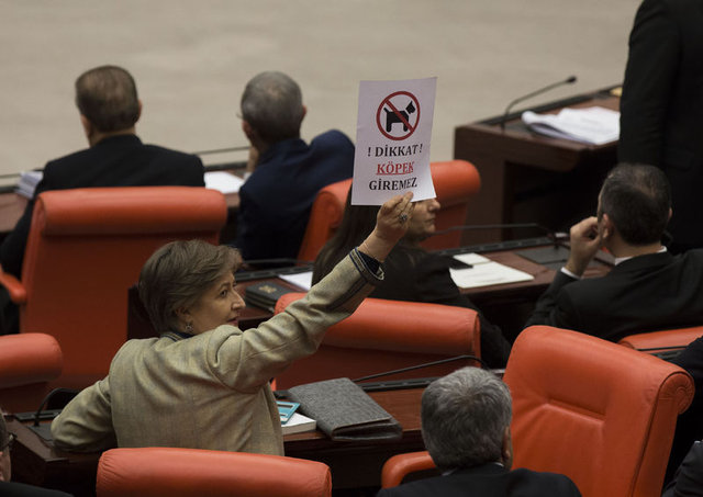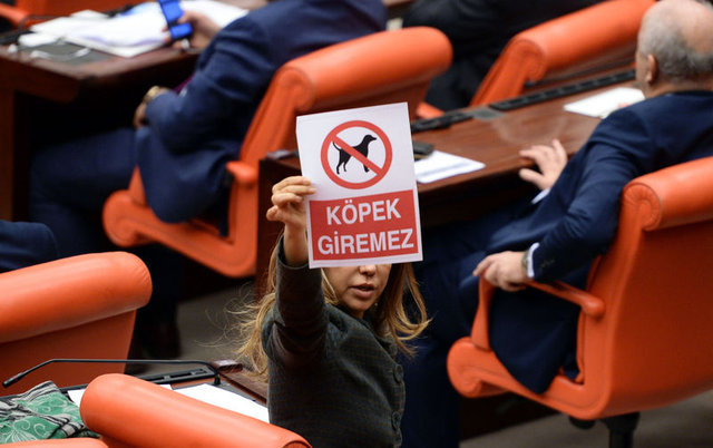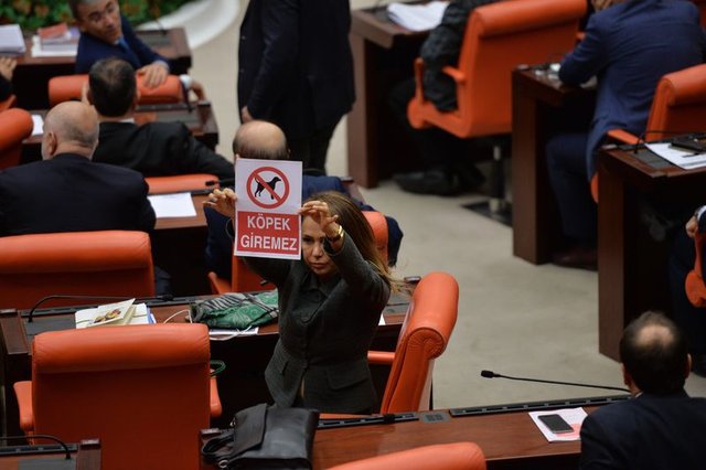 Bu sırada Ak Parti Antalya Milletvekili Gökçen Enç ve İstanbul Milletvekili Mihrimah Belma Satır, üzerinde köpek resmi de bulunan 'Köpek Giremez' yazılı pankartları basın locasına doğru kaldırdı.