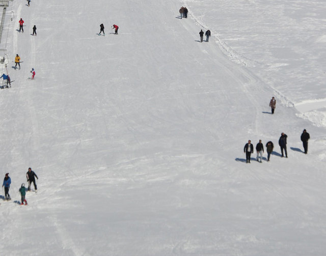 Hediye takımları dönüşümlü olarak kullanan köylüler, kaymak için 3 bin rakımlı Karataş Tepesi’nde hazırladıkları 3 piste tırmanıyor.