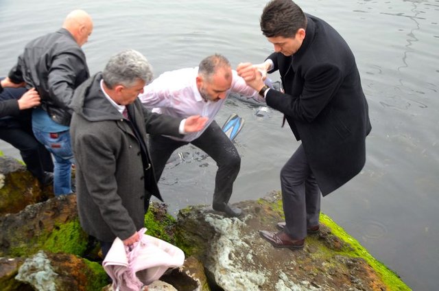 Başkanın denize atlaması, iskelede bulunan herkesi şaşkına çevirdi.