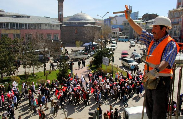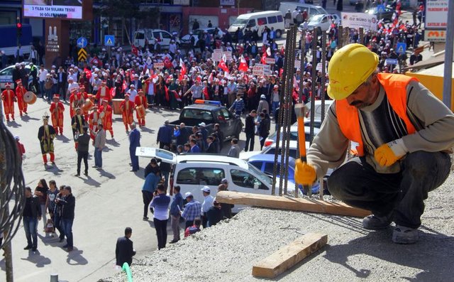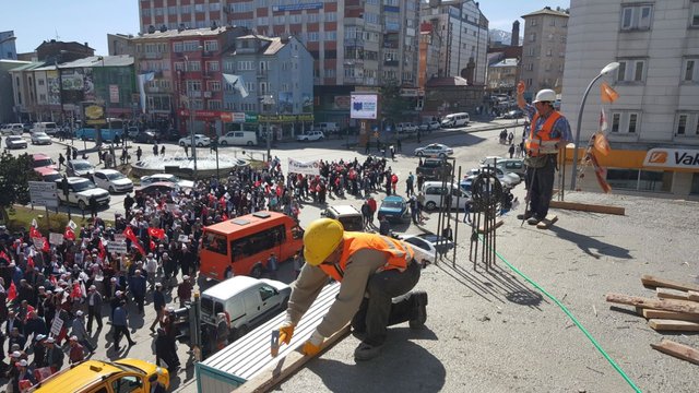 Erzurum'da 1 Mayıs Emek ve Dayanışma Günü etkinlikleri sabah saatlerinde yoğun güvenlik önlemleri altında başlarken, inşaat işçileri görevlerinin başında baretlerini sallayarak göstericileri selamladı