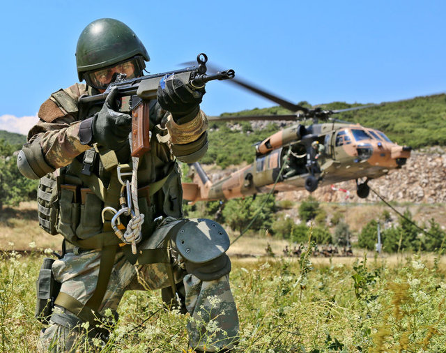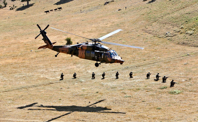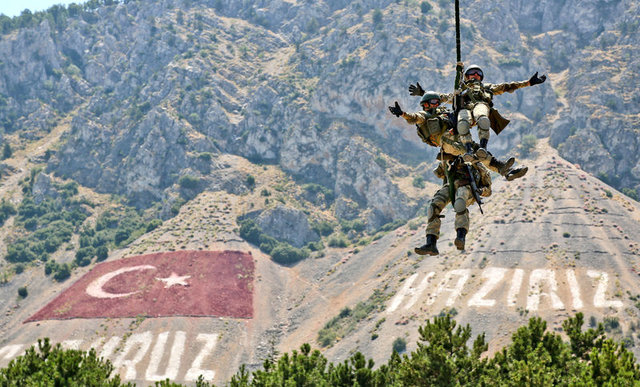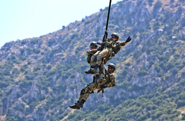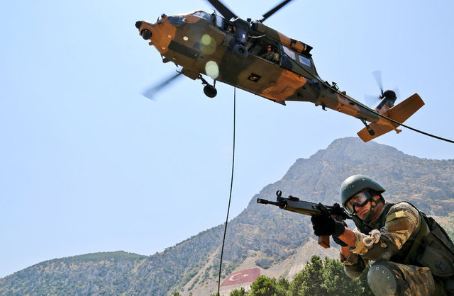 Çabuk iniş taktiğiyle hava hücum harekatı icra eden komandolar, Kirpi ve Kobra tipi araçlarla, `Vatanına Göz Dikeni Ez Oğul´, `Ölürüm Türkiyem´ gibi şarkılar eşliğinde operasyon gerçekleştirdi.