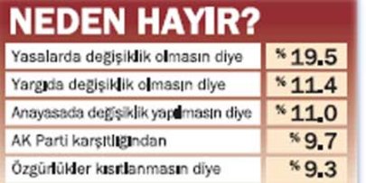 12 Eylül Anayasa referandumunda oy kullananların yüzde 42.2’si, “Hayır” tercihini sandığa yansıttı. Konsensus referandumda “Hayır” oyu verenlerin gerekçelerini de sordu. Buna göre “Hayır” diyenlerin en önemli gerekçeleri, “yasalarda değişiklik olmaması”, “yargıda değişiklik olmaması” ve “Anayasa’da değişiklik yapılmasını istememesi”ydi. İşte sandıktaki “Hayır”ın nedenleri...