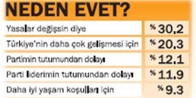 12 Eylül Anayasa referandumunda sandık başına gidenlerin yüzde 57.8’i, “Evet”in üzerine mühür bastı. Pekiyi, seçmen neden “Evet” dedi? Konsensus seçmenin “Evet” tercihinin gerekçelerini de sıraladı. Buna göre “Evet” oyu verenlerin en önemli gerekçeleri “yasaların değişmesi”, “Türkiye’nin daha çok gelişeceğine inanması” ve “siyasi tercihlerinin tutumu”ydu. İşte sandıktan “Evet” çıkmasının nedenleri...