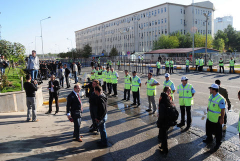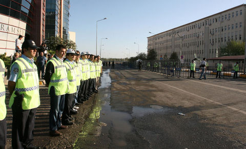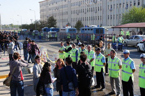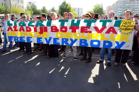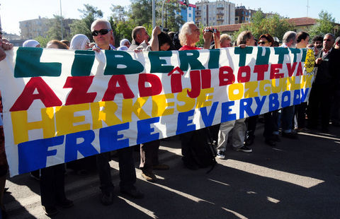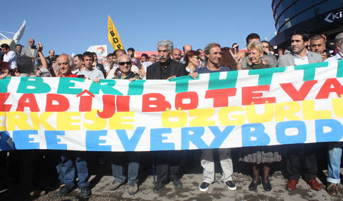 Polis, adliye önündeki güvenlik şeridini kapattıkları gerekçesiyle uyardığı heyettekileri iterek uzaklaştırmaya çalıştı. Bunun üzerine grup üyeleri Kürtçe ?Azadi' (Özgürlük) diye slogan atarak yürüyüşe geçti. Adliye yanındaki Diyarbakır Büyükşehir Belediyesi binasına kadar İtalyanca, İngilizce, Türkçe ve Kürtçe "Herkese özgürlük" yazılı pankartla yürüyen yabancı heyettekilerin, "Çav Bella" şarkısını söylemesi ise dikkat çekti.