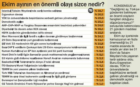 KONSENSUS’un “Geçtiğimiz ay, Türkiye gündemini belirleyen en önemli olayların hangileri olduğunu düşünüyorsunuz?” sorusunda katılımcılara 21 gündem maddesi sıralandı. Ekim ayı içerisinde kamuoyunun en fazla önemsediği bu 21 madde arasında ilk sırada yer alan ise 31 Ekim’de Taksim Meydanı’nda yaşanan terör saldırısı oldu. Bunu Ergenekon davası, YÖK’ün üniversitelerde başörtüsüne serbesti getiren yönetmeliği ve demokratik açılım başlıkları izledi.