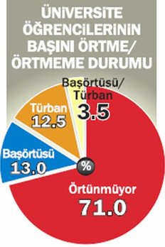 Üniversitelerde öğrenim gören kadın seçmenlerin yüzde 71’i türban ya da başörtüsü takmadığını belirtirken, yüzde 13’ü başörtüsü, yüzde 12.5’i türbanla örtündüğünü söyledi. Bazen başörtüsü bazense türban takanların oranı ise yüzde 3.5 oldu.