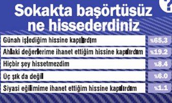 Bu soruyu türban ya da başörtüsü takanların yüzde 65’lik oranı, “Günah işlediğim hissine kapılırdım” şeklinde yanıtlarken, yüzde 19 oranında kadın “Ahlaki değerlerime ihanet ettiğim hissine kapılırdım” cevabını verdi.