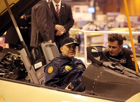 TAI tesislerini gezen Gül, burada pilot ceketi de giyerek bir F-16'nın kokpitine bindi.