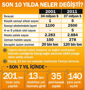 Her ikisi de “Eksiklikler yok mu? Elbette var ama Elazığ’da çok güzel şeyler de oluyor’’ diyor. Yapılan yeni yollar, tüneller, hizmete açılan olimpik havuz, huzurevi ve sayısı 140’ı bulan parklar... “Böyleydi böyle oldu”yu en iyi anlatan şehirlerin başında Elazığ geliyor. 10 yıl önce harabe durumundaki bir binanın nasıl çağdaş bir görünüme kavuştuğunu, yol ve kavşak yapımlarıyla şehrin nasıl modern bir yüze kavuştuğunu, parklarla nasıl nefes aldığını Elazığ hem fotoğraflarla hem de rakamlarla anlatıyor...