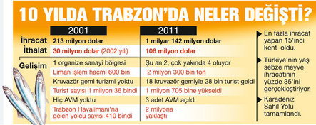 “İhracat rakamı 1 milyar doları aşan şehirler arasında 15’nci sıradayız. İhracat ile ithalat arasındaki farkla, Türkiye birincisiyiz. 113 ülkeye ihracat gerçekleştiriyoruz. Türkiye’deki fındık üretiminin yüzde 10’unu sağlayan Trabzon, fındık ihracatında yüzde 40’lık paya sahip. 2001’de Trabzon Limanı’nın işlem hacmi 600 bin tondu, 2011’de bu rakam 2 milyon 300 bin ton oldu. Organize sanayi bölgesi birken, ikiye çıktı; yetmedi 2 organize sanayi bölgesi daha çalışmaya başlamak için gün sayıyor. Gemi turizminde de önemli adımlar atıldı.”