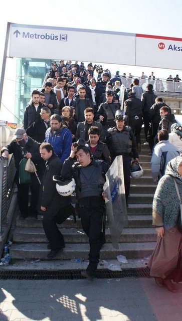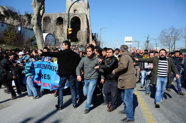 Fatih, Aksaray diğer merkezlerde toplanan grupların Kazlıçeşme'deki alana giriş yapmak için yürüyüşe geçmeleri ve emniyet kuvvetlerinin buna izin vermemesi üzerine İstanbul'da zaman zaman savaşı andıran görüntüler ulaştı. Emniyet kuvvetleri göstericilere gaz bombaları atarken, gösterici gruplar da polislerin üzerine taş atarken çevredeki işyerleri ile otobüs, metrobüs ve bunların duraklarını taşladı, camlarını kırdı. Kaldırım taşlarını sökerek polise atan ve çöp tenekelerini devirerek barikat kuran göstericiler Millet Caddesi'ni adeta savaş alanına çevirdi. Tramvay yolu ve caddeyi trafiğe kapatan göstericiler, bir çevik kuvvet minibüsünü de taş yağmuruna tuttu. Minibüsün bütün camlarını kıran göstericiler, arasokaklara kaçarak dağıldı.