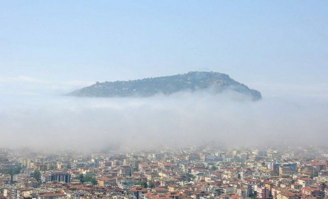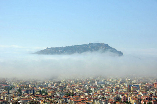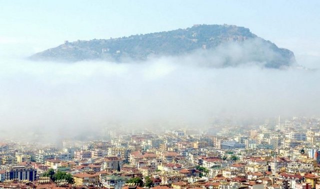 Antalya'nın Alanya ilçesinde nem oranının yüzde 85'e ulaşması üzerine yoğun sis oluştu. İlçe merkezinin üzerine çöken sis ilgi çeken bir görüntü oluşturdu.