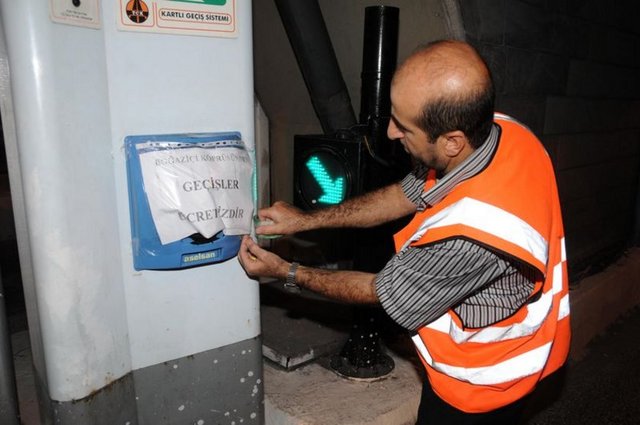 KGS gişelerine gelen görevliler "Boğaziçi Köprüsü'nden geçişler ücretsizdir" yazılarını kart okutma noktalarına yapıştırdı. Buna rağmen birçok sürücü KGS kartlarını makineye sokmaya çalıştı. 2 görevlinin "Geçişler ücretsiz. Bekleme yapmayın" uyarısına aldırış etmediler. Görevlilerin 1 saat sonra bağırmaktan sesleri kısıldı. Buna rağmen KGS gişelerinde araç kuyrukları oluştu. Bir sürücü hem görevlinin uyarısına hem de ücretsiz geçiş kağıdına aldırış etmeden "Kamera şakası bu değil mi? Ben ceza yemem ama" diyerek kartını okutmak için verdiği uğraş gülüşmelere neden oldu. Saatler 01.00'e yaklaştığında bazı araçlar OGS gişesi yerine KGS'ye gişelerine yönelmek için manevra yapması dikkat çekti.