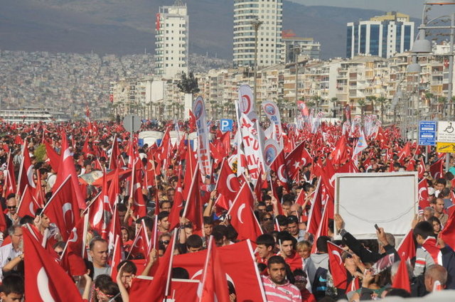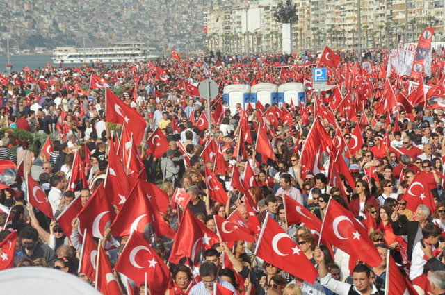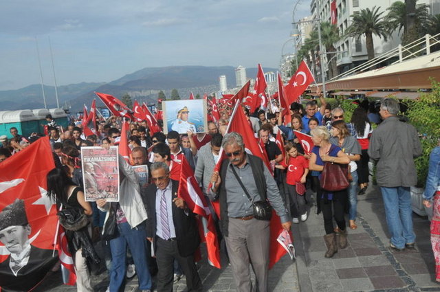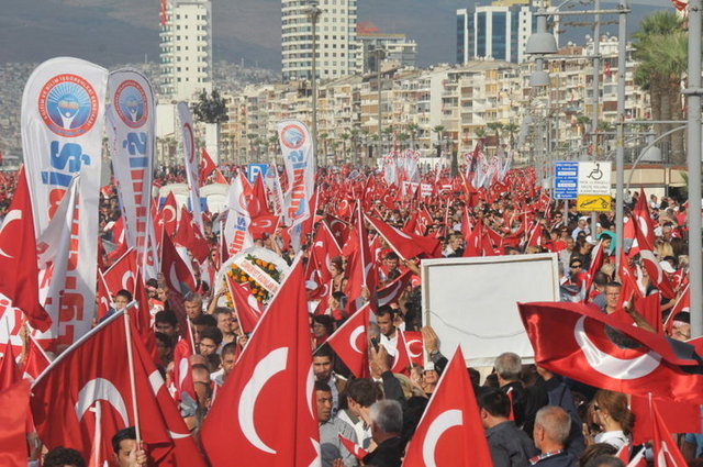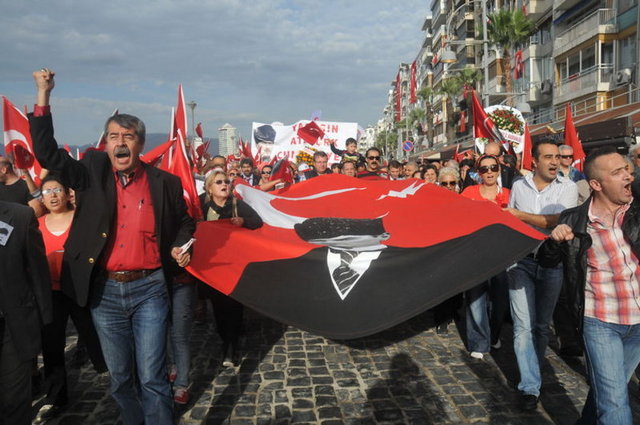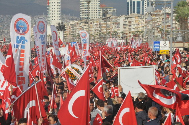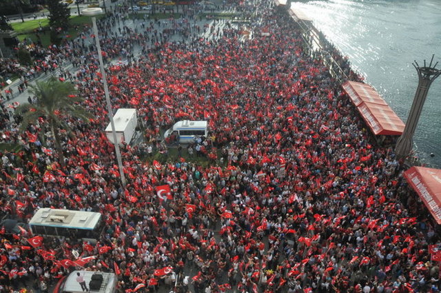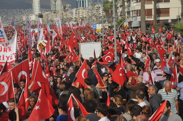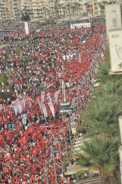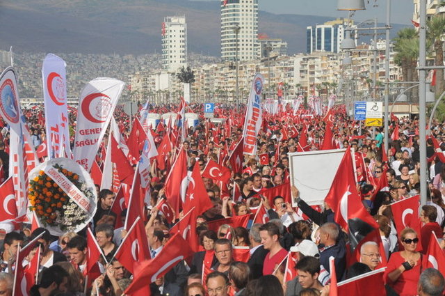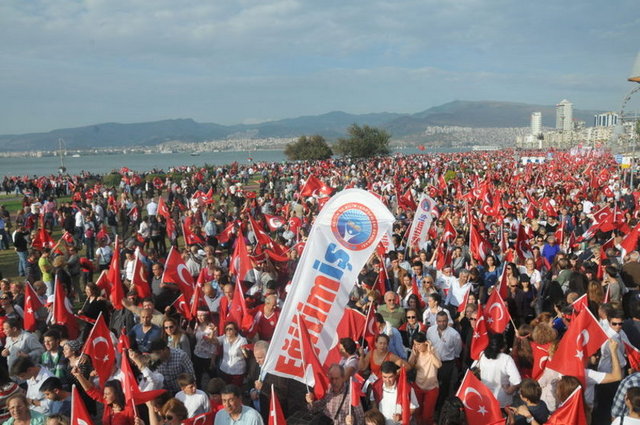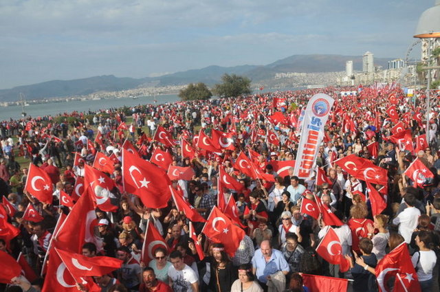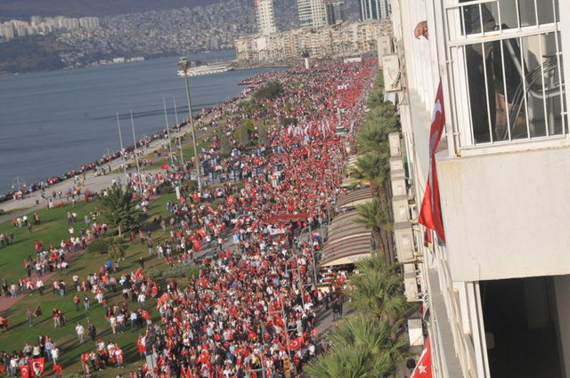İzmir'de Cumhuriyet için Güç Birliği Platformu çatısı altında birleşen Atatürkçü Düşünce Derneği, Çağdaş Yaşamı Destekleme Derneği, Türk Tabipler Odası ile CHP, DSP, İşçi Partisi'nin de bulunduğu 70 sivil toplum örgütü ve siyasi parti tarafından Cumhuriyet Meydanı'nda düzenlenen yürüyüş, mitinge dönüştü.