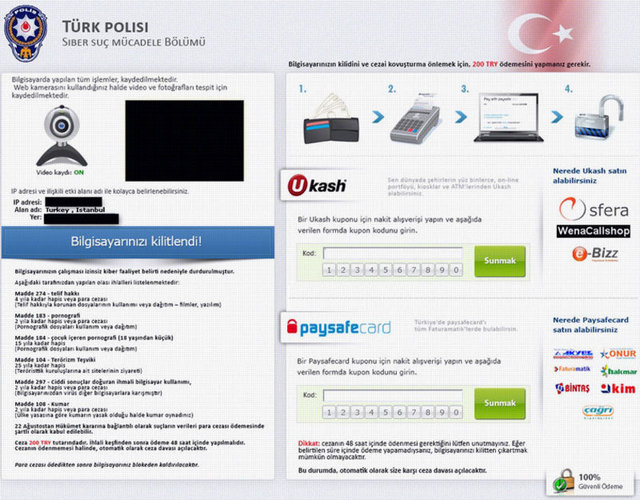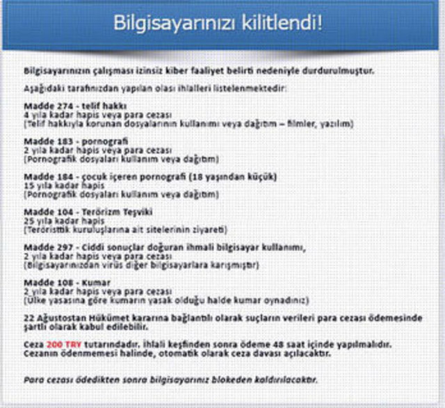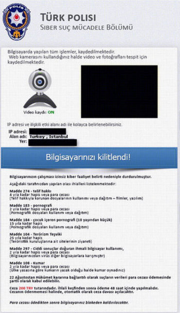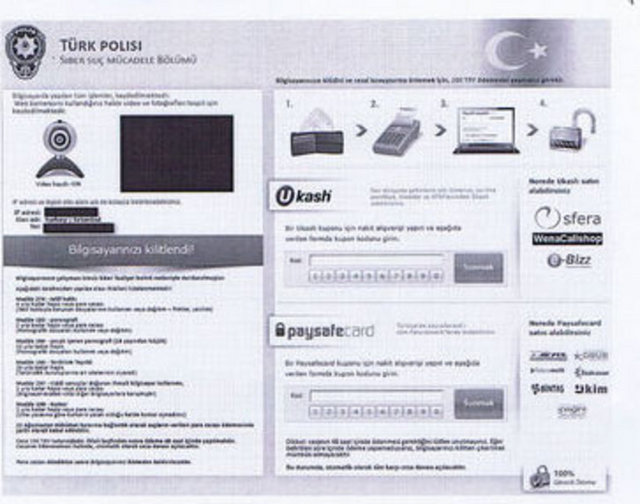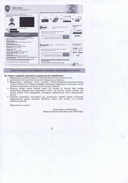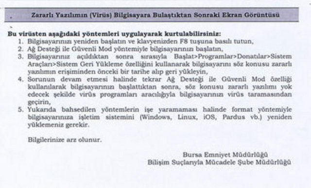 Bursa Emniyet Müdürlüğü Bilişim Suçlarıyla Mücadele Şube Müdürlüğü'nden yapılan açıklamada, son zamanlarda alınan ihbarlar üzerine yapılan incelemede dolandırıcıların vatandaşların bilgisayarlarına çeşitli internet sitelerinden sızdığı düşünülen zararlı bir yazılım (virüs) aracılığıyla, bilgisayarlarını kilitledikleri ve 'Türk Polis' logosu kullanılarak halktan para talep edildiğinin ortaya çıkarıldığı belirtildi. Yapılan incelemelerde zararlı yazılımın bilgisayarın açılması ile ekranı kapladığı ve masaüstüne erişimi engellediğinin vurgulandığı açıklamada, "Bu sırada 'bilgisayarınız kilitlendi' uyarısı verilerek, bilgisayar kilidinin ve cezai kovuşturmanın önlenmesi için 200 TRY ödeme yapılması gerektiği yazılıyor. Ödeme sonucu bilgisayarın kullanıma geri açılacağı vaadinde bulunuluyor. Ayrıca Türk Polis logosu ve 'Türk Polisi Siber Suç Mücadele Bölümü' ibaresi kullanılarak yapılan dolandırıcılıktaki inandırıcılık artırılmak isteniyor. Bilinmelidir ki, Emniyet Genel Müdürlüğü'ne bağlı birimlerin böyle bir uygulaması bulunmamaktadır. Yapılan ön incelemelerde kullanıcıların bilgisayarlarına yerleştirilen virüs tarafından ekranlarının kilitlendiği belirlenmiştir. Bu virüsün, kullanıcıları dolandırmayı hedefleyen şahıslar ya da suç örgütleri tarafından kullanıldığı düşünülmektedir. Herhangi bir mağduriyetin yaşanmaması için bilgisayarına virüs yerleşmiş vatandaşlarımızın kesinlikle para yatırmamaları, kimlik bilgilerini kimseyle paylaşmamaları gerekmektedir."