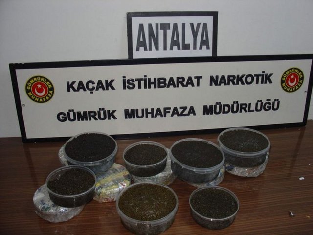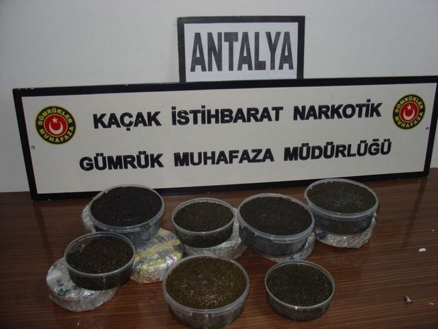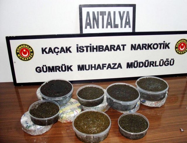 Batı Akdeniz Gümrük ve Ticaret Bölge Müdürlüğü ile Antalya Gümrük Muhafaza Kaçakçılık ve İstihbarat Müdürlüğü ekipleri, Antalya Havalimanı Dış Hatlar Terminali'nde 11 kilo siyah havyar ele geçirdi. Gümrük ekipleri, Rusya'nın Moskova kentinden gelen ve muhasebeci olduğu öğrenilen I.S. adlı kadın turistin valizi x-ray cihazından geçerken bir ağırlık tespit etti.