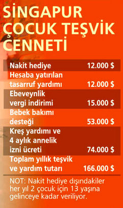 Başbakan Erdoğan'ın 3 çocuk isteğinin ardından hazırlığı süren çocuk teşviklerinin dünyada çarpıcı örnekleri var. İlk Avustralya'da başlayan bebek yapana nakit bonus, sonra diğer ülkelere yayıldı. Singapur, 12 bin dolarla en yüksek nakit yardımı verirken, Kanada 8 bin dolarla ikinci sırada yer alıyor