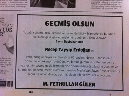 Bugünkü Zaman Gazetesi'nde 'Fethullah Gülen' imzasıyla; 'Geçmiş olsun' başlıklı ilan yayınlandı. İlanda şöyle denildi: