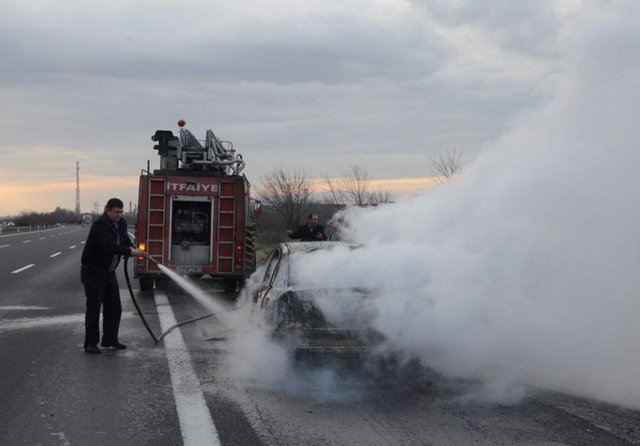 Tekirdağ'ın Çorlu İlçesi TEM otoyolunda hareket halindeyken alev alan bir otomobil yanarak kullanılamaz hale geldi. Otomobil sürücüsü Hüseyin Çay, aracının yanışını çaresizlik içinde izledi.