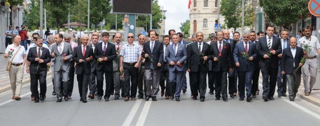 Yaklaşık 1 saat boyunca yürüyen kalabalık grup, Mevlana Caddesi ve kent meydanı üzerinden hareket ederek Atatürk Caddesi üzerinden eski Madımak Oteli, şimdiki Bilim ve Kültür Merkezi'nin bulunduğu Eski Belediye Sokak önüne kadar geldi. Saygı duruşunun ardından olayda ölenlerin isimleri tek tek okunurken, grup 'Burada' diye karşılık vererek yoklama yaptı.