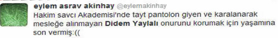 Yaylalı’nın (26) bir arkadaşı, attığı twit’le genç avukatın tayt giydiği için hâkim olamadığını iddia etti.