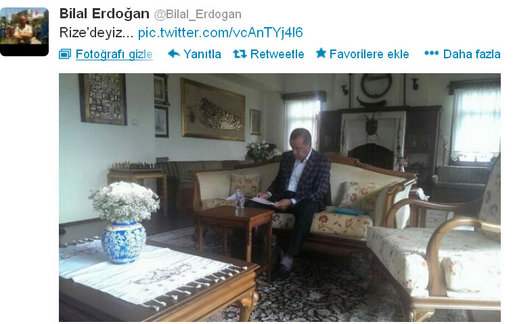Dün toplu açılış törenlerine katılmak üzere Rize'ye gelen Başbakan Erdoğan, geceyi baba ocağında geçirdi. Bilal Erdoğan, babasının bugün yapacağı konuşma üzerinde yaptığı çalışmayı gösteren fotoğrafı Twitter'dan paylaştı.