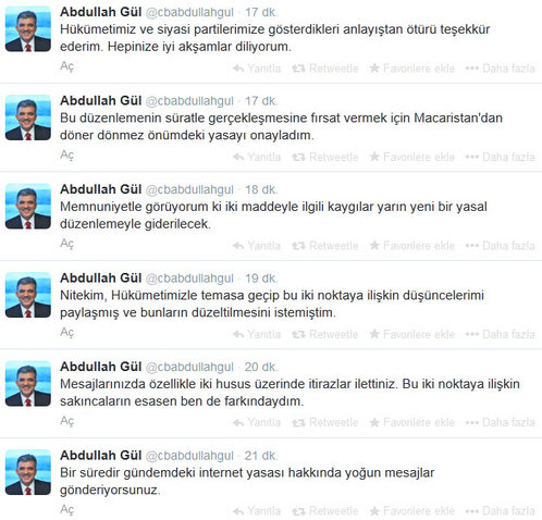 Cumhurbaşkanı Abdullah Gül, Twitter'daki hesabından "İnternet Yasasını" onayladığını duyurdu. Gül, "2 maddeyle ilgili kaygılar yarın yeni bir yasal düzenlemeyle giderilecek" dedi. Bu arada İnternet Yasası'nda değişiklik öngören yeni düzenleme Meclis'e sunuldu.