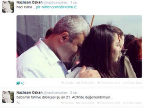 İstanbul 21. Ağır Ceza Mahkemesi'nde babasının tahliye talebi görüşülen Tuncay Özkan'ın kızı Nazlıcan Özkan babasıyla bir resmini paylaşıp tweet attı.