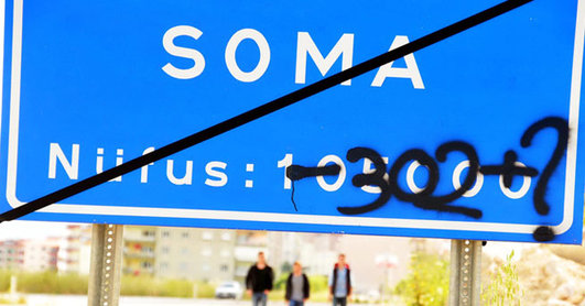 Soma'daki Türkiye'yi yasa boğan faciaya farklı kesimlerden tepkiler sürerken, ilçenin Bergama yolu çıkışındaki nüfus 105 bin yazılı tabelaya bir grup tarafından sprey boyayla "-302+?" yazılıp, siyah kurdele takıldı.