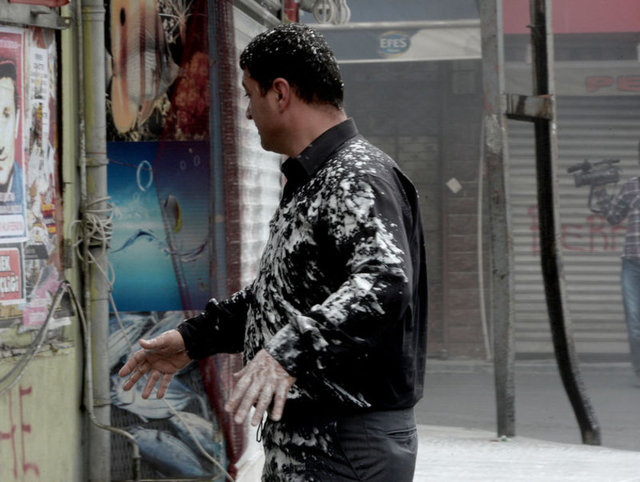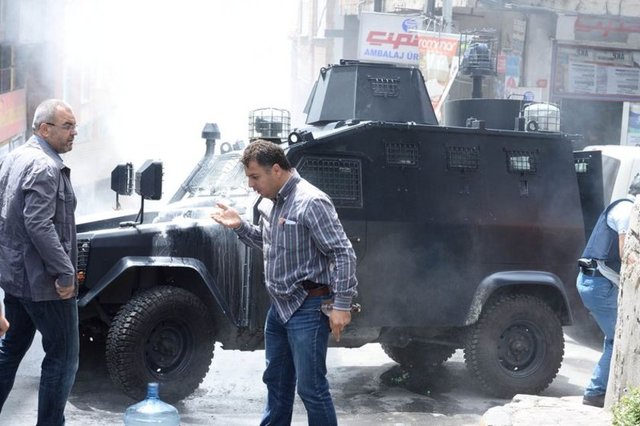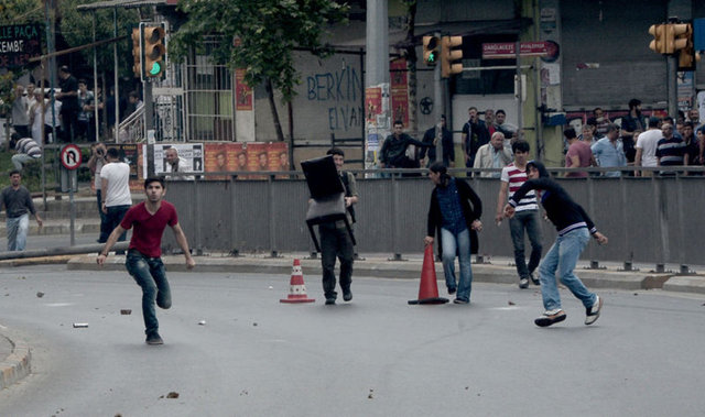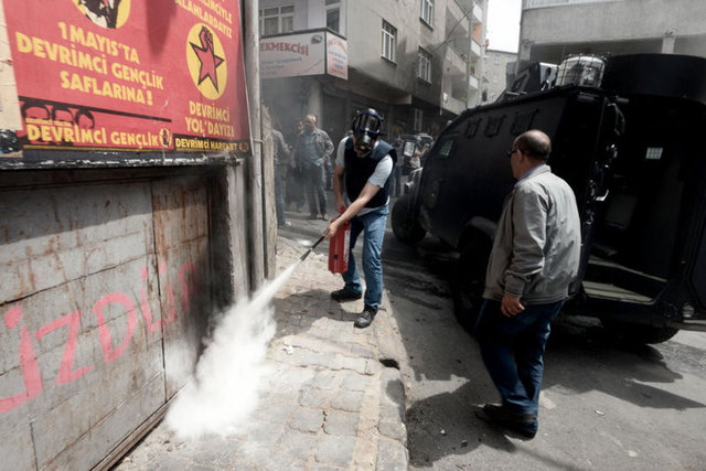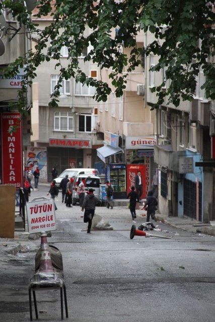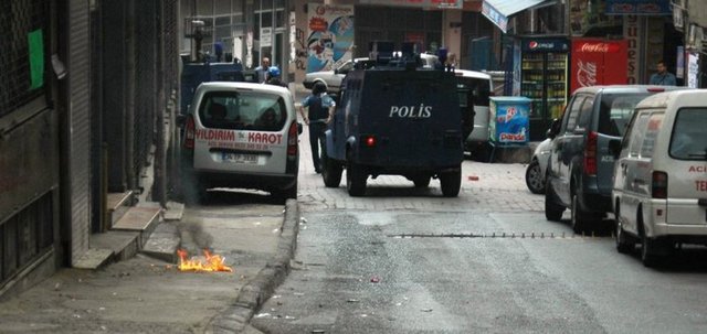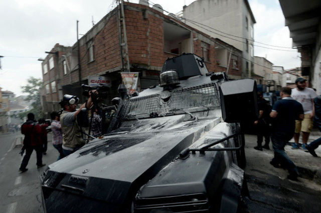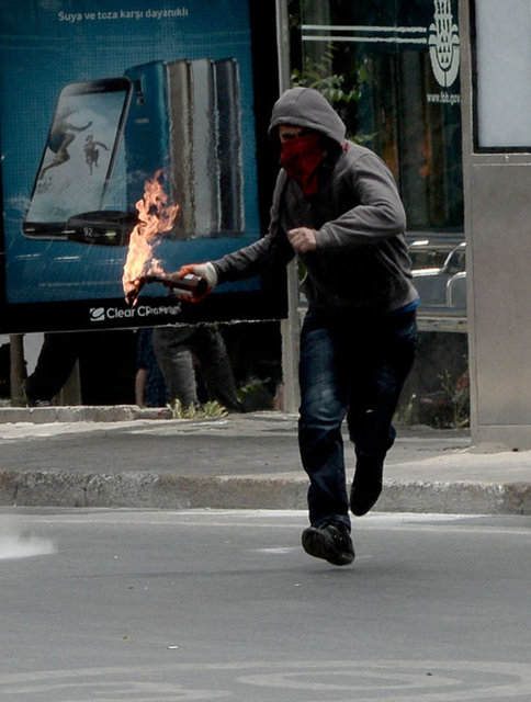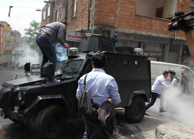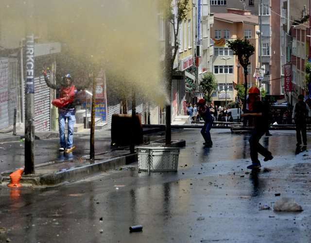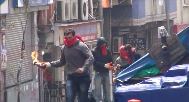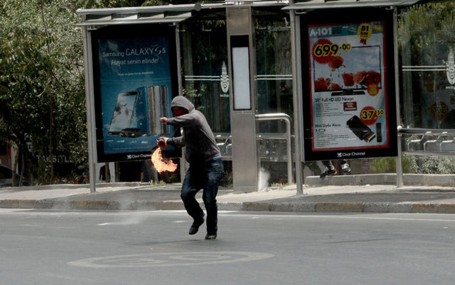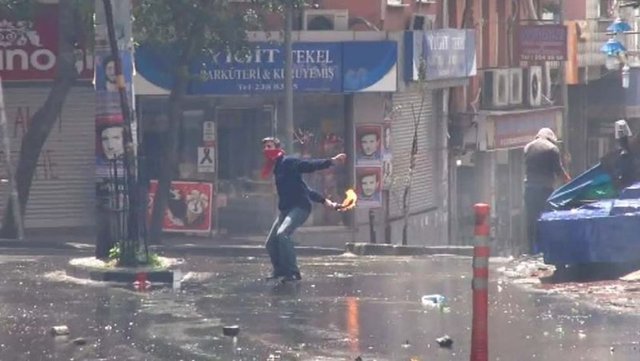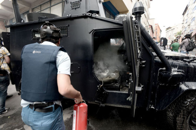Bu sırada polisin "akrep" adı verilen zırhlı aracına molotofkokteyli isabet etmişti. Polis aracı alev alırken, araçtan inen polis memuru havaya ateş açmıştı.