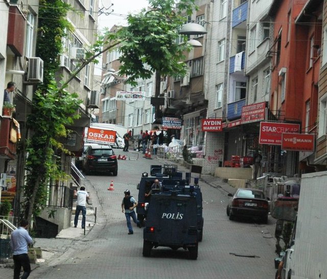 Gruptan bazı kişilerin, cadde üzerinde bulunan polise ait bir zırhlı aracı tekmeledikleri görüldü. - Aynı dakikalarda, Piyalepaşa Caddesi üzerinde toplanan başka bir grup da Çevik Kuvvet polislerine taş ve şişe attı. -