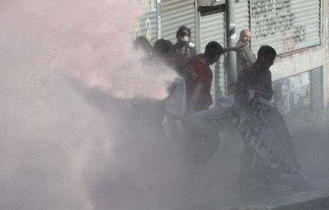 "Katil polis bir canımızı daha vurdu - Hesabını soracağız" yazılı pankart açan grup, polise taş, şişe ve molotof kokteyli atmaya başlayınca, polis de tazyikli su ve gaz bombalarıyla karşılık verdi.