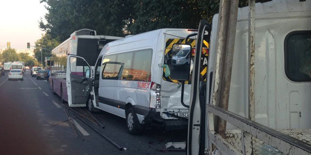 Belediye otobüsüne çarpan servis aracına ise arkadan hızla gelen demir çubuk yüklü kamyonet çarptı.