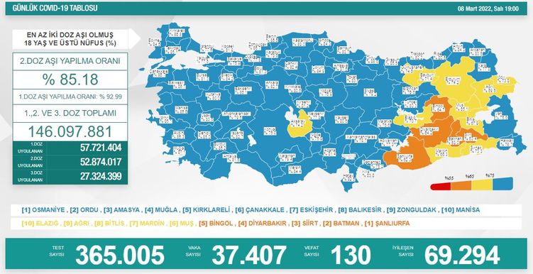 8 Mart Salı günü Türkiye koronavirüs tablosuna göre son 24 saatte 37 bin 407 vaka tespit edildi. Virüs nedeniyle hayatını kaybedenlerin sayısı 130 oldu.