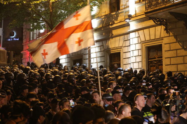 En son dün gece saatlerinde Tiflis'te Parlamento Binası'nın önünde düzenlenen gösteride binlerce kişi ile polis arasında arbede çıktı.