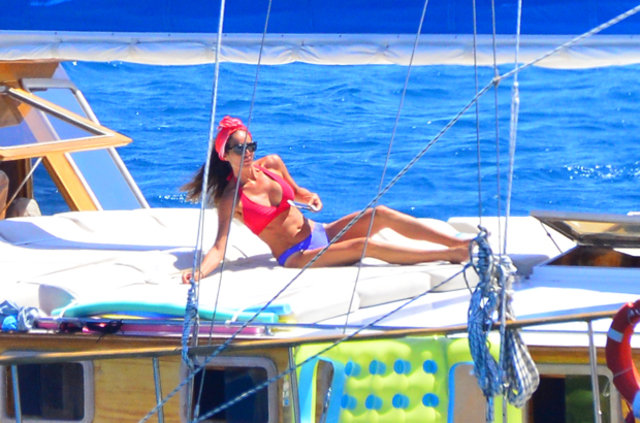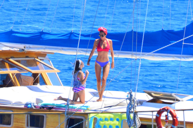 Teknede eşi Adnan Aksoy ve çocuklarıyla eğlenceli saatler geçiren Güzide Duran düzgün fiziği ile dikkat çekti.