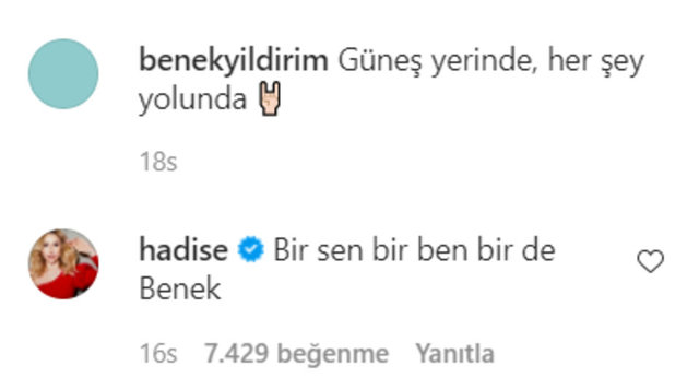 Şarkıcı, bu kareye "Bir sen, bir ben, bir de Benek" yorumunu yaptı.