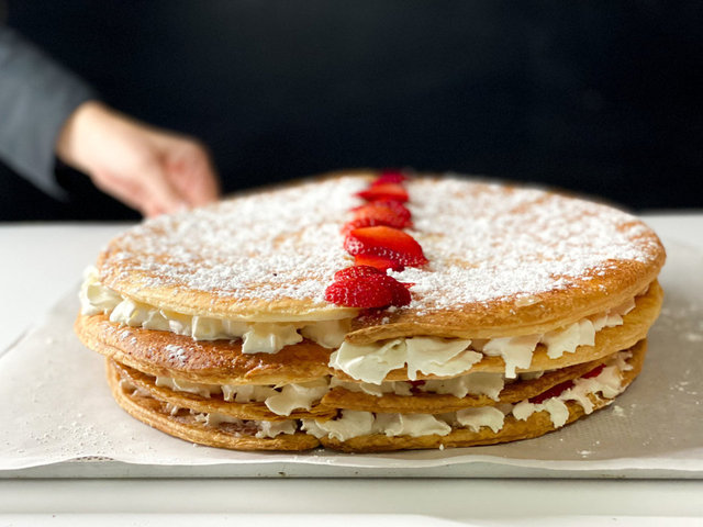 Karışım koyulaşınca vanilyayı ekleyin ve soğumaya bırakın. Krema ılıyınca, toz şantiyi ekleyip iyice çırpın. Hazırladığınız kremayı milföyün ters yüzüne sıkın ve doğranmış çilekleri ekleyin. Diğer milföy parçasını üzerine kapatın ve isterseniz bu işlemi iki üç kat olacak şekilde tekrarlayın. Son olarak üzerine çilek koyun ve pudra şekeri serpin.