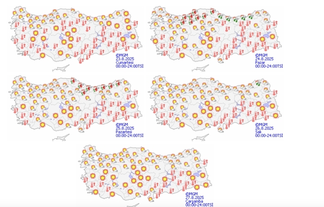 Meteoroloji Genel Müdürlüğü'nden hafta sonuna ilişkin hava durumu tahminleri geldi. Meteoroloji tarafından güncellenen haritaya göre sıcaklıklar mevsim normallerinin üzerine çıkıyor. Rüzgarın genellikle kuzey ve batı yönlerden hafif, ara sıra orta kuvvette esmesi bekleniyor. İşte 23-24 Ağustos güncel hava durumu raporu