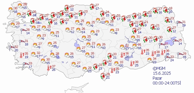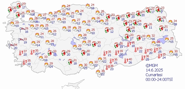 14 Haziran Cumartesi günü tahmini olarak öğlen saatlerinden itibaren Sivas, Erzincan, Erzurum, Gümüşhane gibi merkezlerde kuvvetli sağanak görülecek. Doğu Anadolu dışında Konya çevrelerinde ve Pozantı-Adana arasında gök gürültülü yağmurlar görülebilir. Bu yağışlar günün özellikle saat 13:00-16:00 arası daha kuvvetli olacaktır. Cumartesi beklenen bu yağışlar esnasında lokal olarak dolu yağışları da görülebilir.
