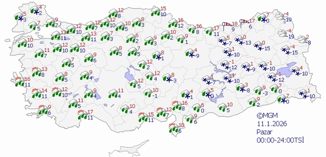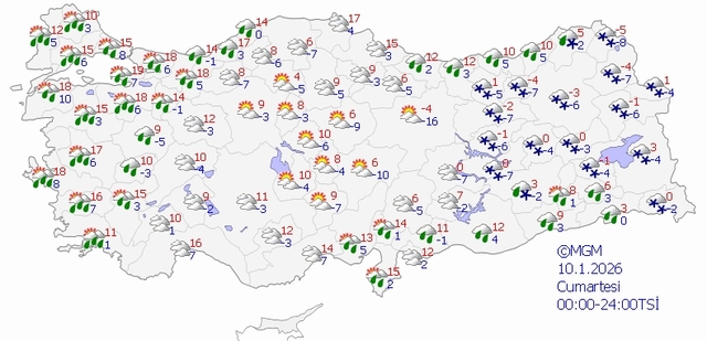 Meteoroloji Genel Müdürlüğü tarafından yapılan tahminlere göre: Ülkemiz genelinin parçalı ve çok bulutlu, Marmara ve Ege'nin batısı, Doğu Akdeniz ve İç Anadolu'nun doğusu, Orta ve Doğu Karadeniz, Doğu ve Güneydoğu Anadolu Bölgeleri ile Bartın, Karabük, Kastamonu kıyıları, Antalya'nın batı ilçeleri ve Alanya çevrelerinin yağışlı geçeceği tahmin ediliyor. Kıyı kesimleri, Marmara ve Ege ile Güneydoğu Anadolu’nun güneyinde yağmur ve sağanak, yurdun doğusunda karla karışık yağmur ve kar şeklinde olması beklenen yağışların, Trakya'nın kuzey ve batısı, Ege ve Doğu Karadeniz kıyıları ile Hakkari ve Ordu çevrelerinde yer yer kuvvetli olacağı tahmin ediliyor. Gece ve sabah saatlerinde iç ve doğu kesimlerde buzlanma ve don olayı bekleniyor. Doğu Karadeniz’in iç kesimlerinin yüksekleri ile Doğu Anadolu’nun doğusunun yüksek kar örtüsüne sahip eğimli kesimlerinde çığ tehlikesi bulunmaktadır.